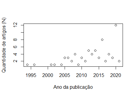 Pelos nomes que deste aos eixos, parece que a variável dependente é inteira¹ ("Qtde. de artigos [N]"), por outro lado, a variável independente é um ano calendário, que por definição é uma variável ordinal arbitrária (a faixa 1994 -- 2021 poderia ser noutros calendários diferente, por exemplo no Bahá'i de 157 a 178, etc.).