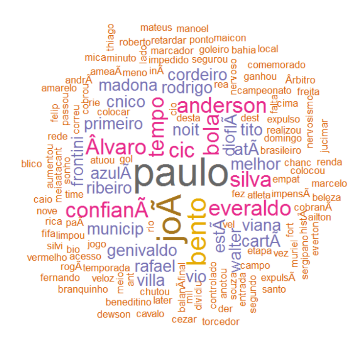 Pessoal, boa noite! Com base em um exemplo pego na internet, tentei fazer uma nuvem de palavras de um arquivo notepad (peguei uma pequena matéria na internet e salvei, em .txt, com o nome SaoBento). O código tem funcionado quase corretamente. O problema é que eu não tenho tido sucesso em corrigir o *encoding* do texto. - Tentei usar encoding = "UTF-8" na linha do readlines, mas sem sucesso. - Também tentei usar enc2native() na última linha do passo 7, mas ocorre erro argument is not a character vector. - Salvei o arquivo SaoBento.txt no Notepad++, usando UTF-8 e, também, a nuvem final acusou problemas de *encoding*. - Deixei o arquivo SaoBento.txt salvo sozinho em uma pasta e, também, não tive sucesso em acertar o *encoding*. Sendo assim, gostaria de saber se alguém poderia fornecer uma dica de como posso driblar esse problema. Agradeço pela atenção. Saudações, -Max Lara #============================================== # WORDCLOUD #============================================== *#1) INSTALL REQUIRED PACKAGES* install.packages("tm") #for text mining install.packages("SnowballC") #for text stemming install.packages("wordcloud") #wordcloud generator install.packages("RColorBrewer") #color palletes *#2) LOAD REQUIRED PACKAGES* library("tm") library("SnowballC") library("wordcloud") library("RColorBrewer") *#3) TEXT MINING* #LOAD THE TEXT (SAVED LOCALLY) text <- readLines(file.choose()) *#4) LOAD THE DATA AS A CORPUS* docs <- Corpus(VectorSource(text)) #VectorSource() function creates a corpus of character vectors docs <- tm_map(docs, PlainTextDocument) *#5) TEXT TRANSFORMATION* #tm_map() function (to replace, for instance, special characters from the text). #Replacing "/", "@" and "|" with space: toSpace <- content_transformer(function (x , pattern ) gsub(pattern, " ", x)) docs <- tm_map(docs, toSpace, "/") docs <- tm_map(docs, toSpace, "@") docs <- tm_map(docs, toSpace, "\\|") *#6) TEXT CLEANING* #tm_map() (remove unnecessary white space, to convert the text to lower case) #Removing common stopwords docs <- tm_map(docs, content_transformer(tolower)) #Convert the text to lower case docs <- tm_map(docs, removeNumbers) #Remove numbers docs <- tm_map(docs, removeWords, stopwords("portuguese")) #Remove Portuguese common stopwords docs <- tm_map(docs, removePunctuation) #Remove punctuations docs <- tm_map(docs, stripWhitespace) #Eliminate extra white spaces docs <- tm_map(docs, stemDocument) #Text stemming *#7) BUILD A TERM-DOCUMENT MATRIX (TDM)* #TDM is a table containing the frequency of the words. #Column names are words #Rown names are documents dtm <- TermDocumentMatrix(docs) terms(dtm) m <- as.matrix(dtm) v <- sort(rowSums(m),decreasing=TRUE) d <- data.frame(word = names(v),freq=v) head(d, 10) AQUI_ERRO <- d$word *#8) GENERATE THE WORD CLOUD* wordcloud( words = AQUI_ERRO, freq = d$freq, min.freq = 1, max.words=200, random.order=FALSE, rot.per=0.35, colors=brewer.pal(8, "Dark2")) *saída:* [image: Inline image 1]