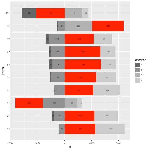 Prezados tenho um conjunto de dados que desejo apresentar de forma que fique semelhante a imagem abaixo. Entretanto não sei como plotar as frequências nas categorias das respostas. A imagem é do site: https://sebastiansauer.github.io/plotting_surveys/